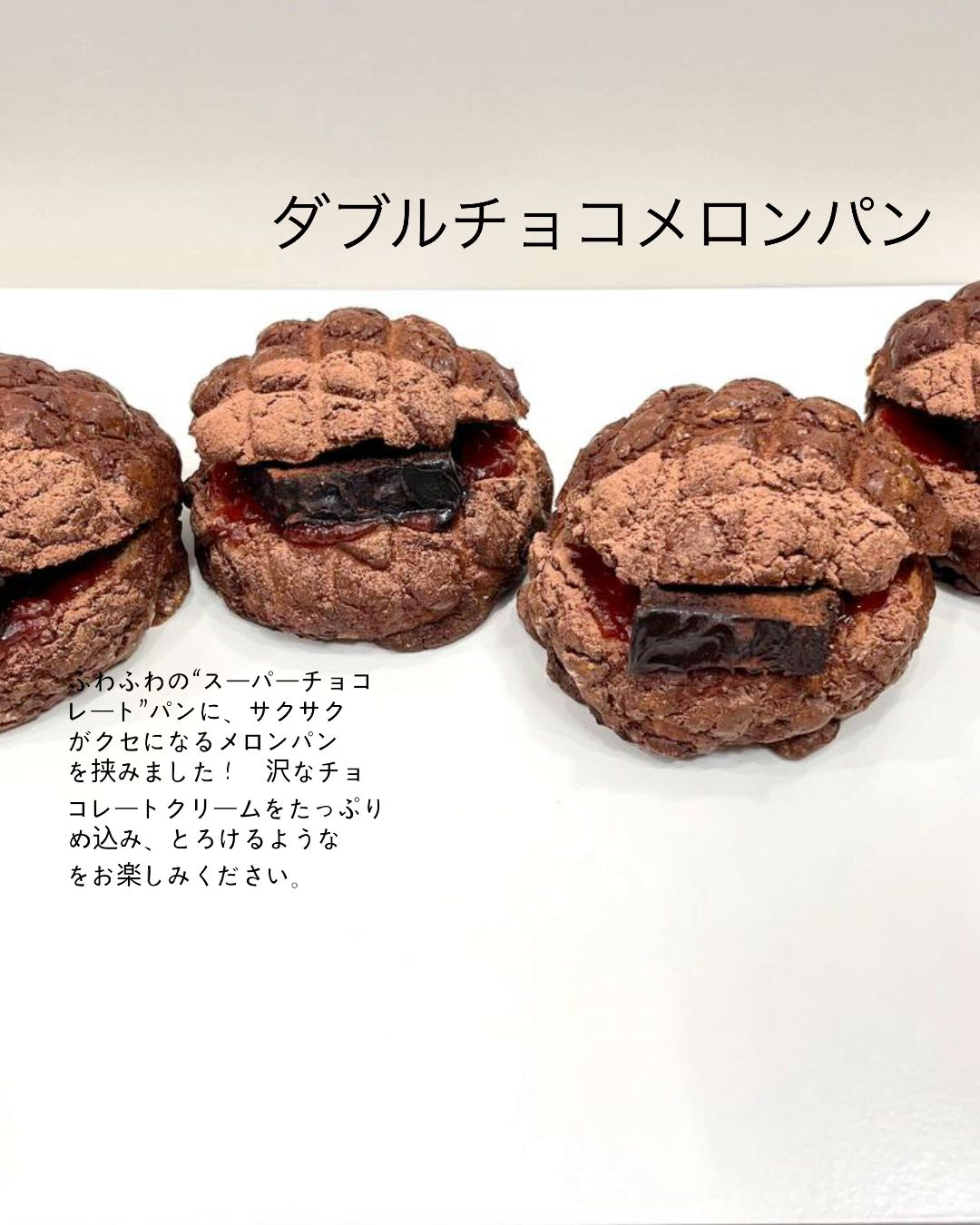 – ダブルチョコメロンパン (Double Choco Melon Pan) Roti “super cokelat” yang fluffy dengan lapisan kulit melon pan yang renyah dan nagih ! Manjakan lidah dengan isian krim cokelat lembut yang mewah.