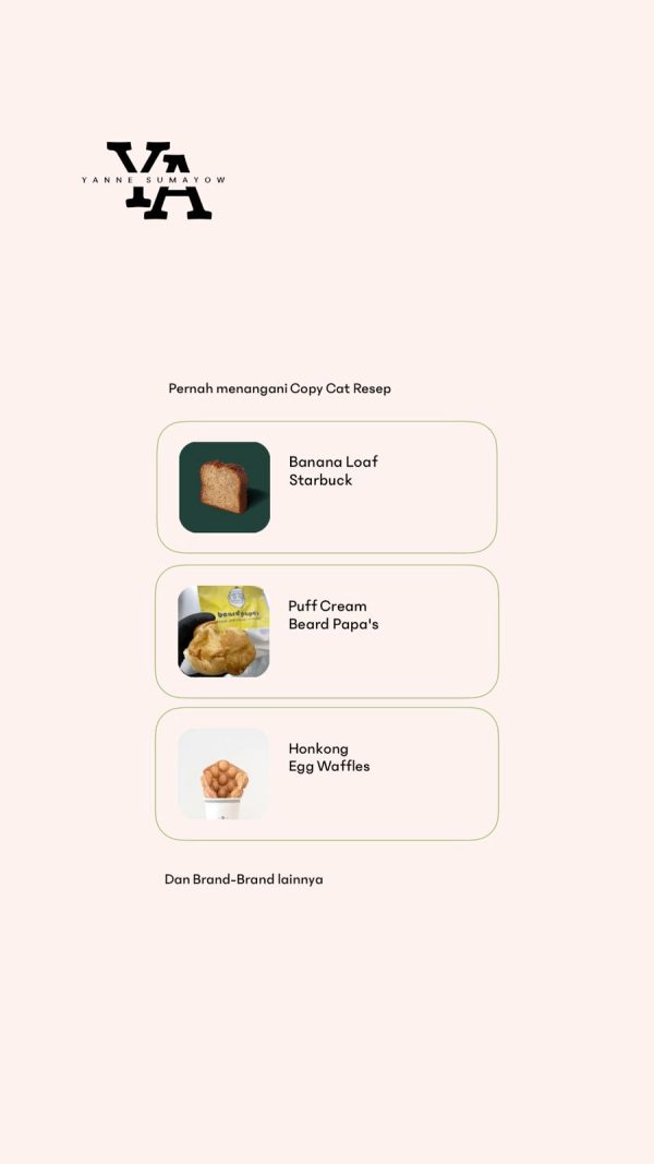 – Yang didapatkan (Duplikasi Resep sebuah Produk skala National / International dalam bentuk File Pdf & Sistem Pantry di Pdf serta Video penunjang & Private Chat dengan Baker selaku Recipe Developer)