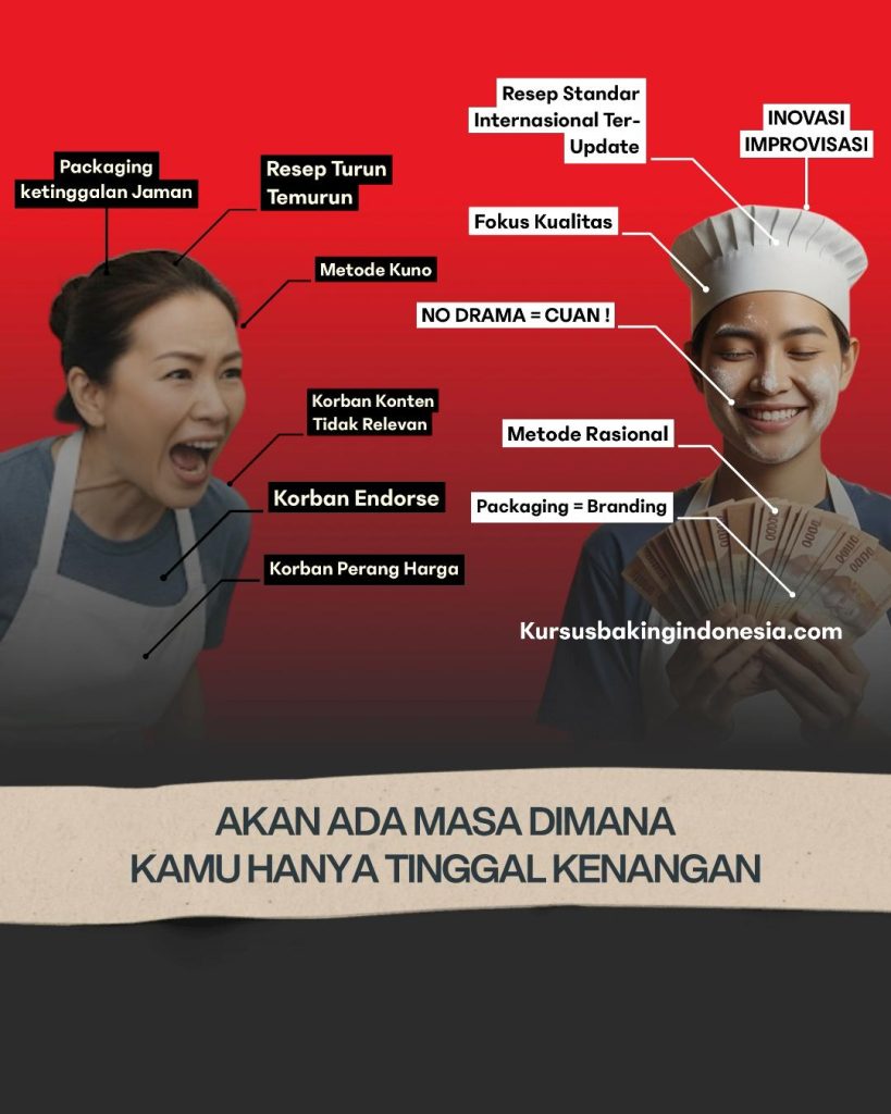 Kesempatan ini tak selamanya ada. Jangan biarkan bakery kamu jadi cerita kegagalan. Ambil mastery class di kursusbakingindonesia.com sekarang juga. Lindungi bisnismu, amankan masa depanmu, dan jadilah yang terdepan, bukan yang tergilas.